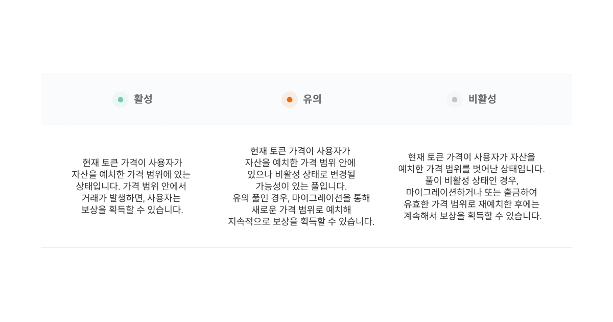 반면 현재 토큰 가격이 예치한 가격 범위를 벗어나는 경우(비활성)에는 더이상 내가 공급한 자산이 스왑에 사용되지 않아, 일반적으로 풀에서 분배되는 보상(스왑 수수료와 리워드 토큰)을 획득할 수 없습니다. 그러므로 자산을 공급한 사용자는 공급한 가격 범위가 유효(활성)한 상태인지 항상 주의하여 자산을 관리해야 합니다.
