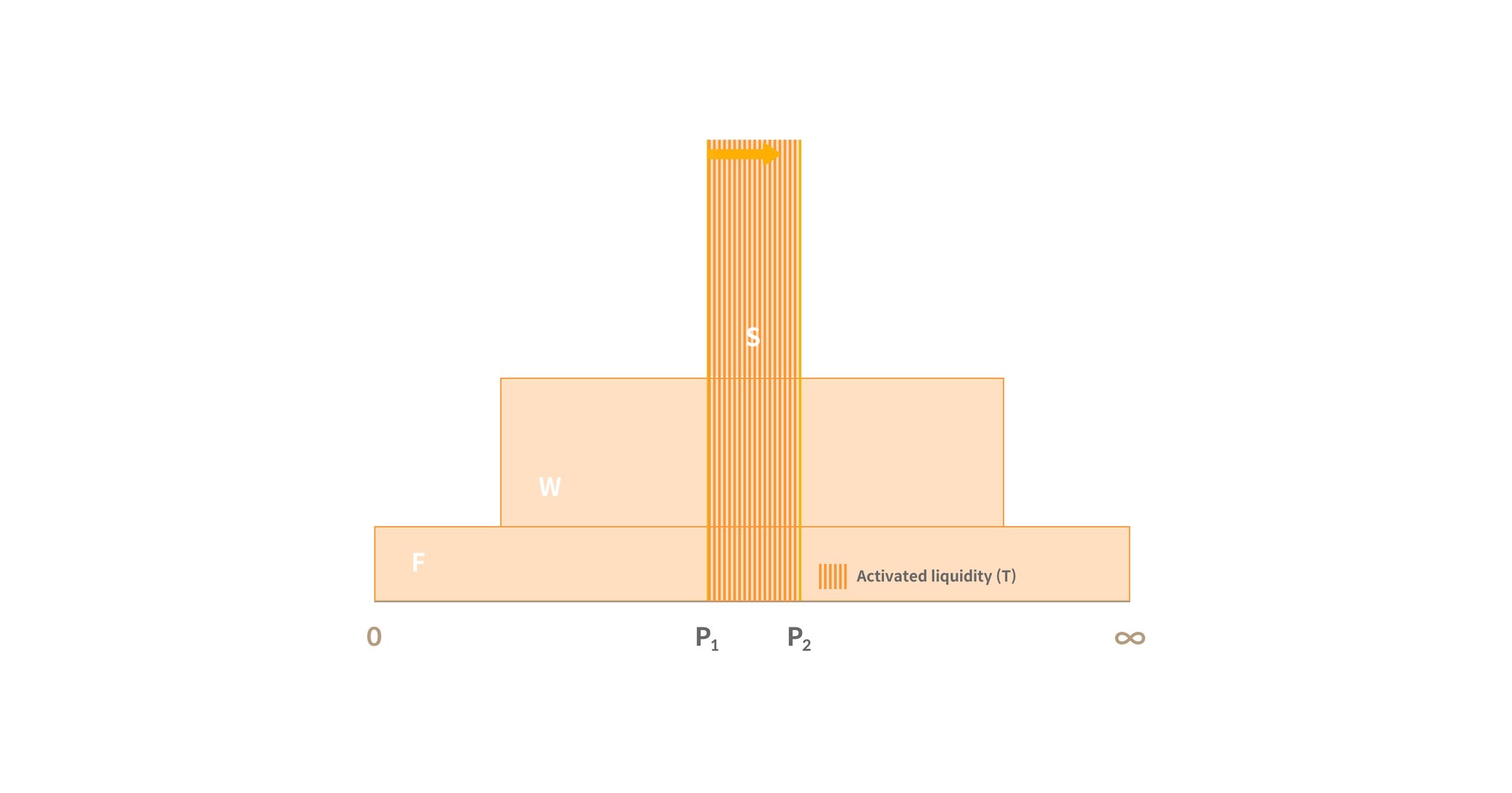 If the token price changes from P0 to P2 due to a transaction within the pool, User A's assets will not be used in the P0 to P1 range. Instead, user A's liquidity will be used for trading in the P1 to P2 range. The share ratio of user A in the active trading liquidity in the P1 to P2 range is (user's liquidity (A)/activated liquidity (T).