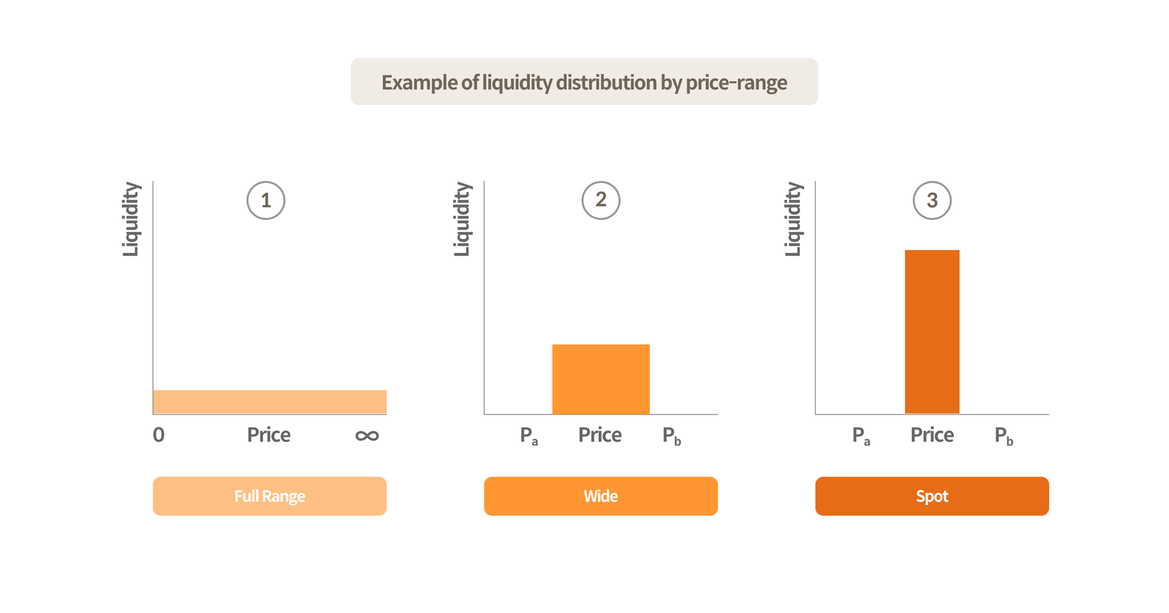Let’s say a $1,000 asset is supplied in Full Range. In that case, as shown in Figure ①, the asset will be equally supplied in the entire price range (0~∞). However, when the asset is supplied in a narrower price range (Pa~Pb), as shown in Figures ② and ③, suppliers can enjoy the effect of higher liquidity supply even with the same amount of asset.